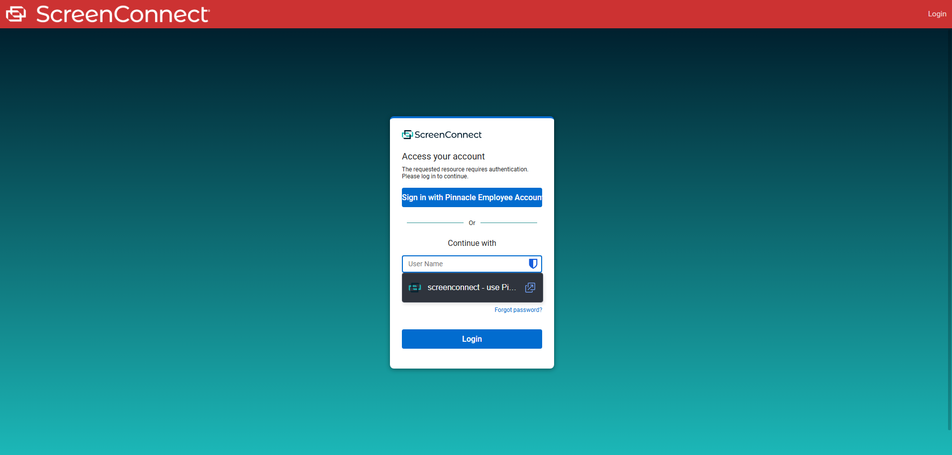 To begin using ScreenConnect, go to https://screenconnect.pinnacletechnology.solutions/ in the Chrome or Safari web browser and click the 'Login' link in the upper right corner.