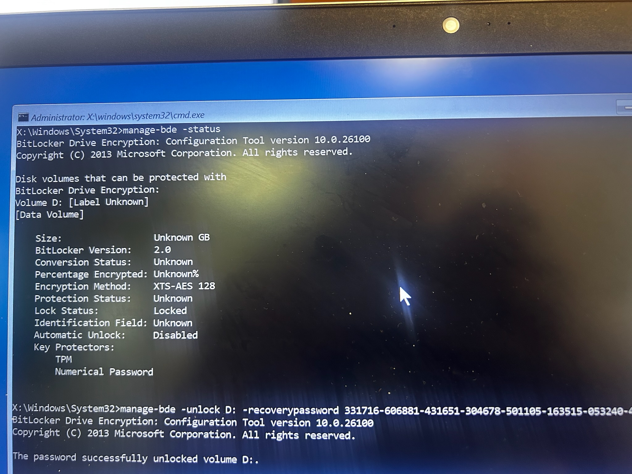 Note: Review the output to see which volume is currently locked (e.g., "Volume D:"). Because the recovery environment can reassign letters, the OS drive may not always be C:. You must use the specific drive letter identified here for the next steps.